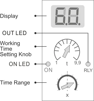 Щоб встановити діапазон часу, перемістіть ручку «x» у потрібне значення. Права сторона утримується ручкою x: щоб встановити часовий діапазон, перемістіть ручку «x» в потрібне значення 9,9 сек., 99 сек., 9,9 хв., 99 хв., 9,9 годин., можуть бути встановлені 99 годин 6 різних періодів часу. Коли діапазон часу встановлено під час увімкнення пристрою, пристрій повинен бути вимкнений і повторно заряджений, щоб регульований діапазон часу був дійсним.