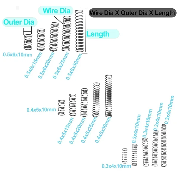 Пружини виготовлені з міцної сталі, що забезпечує довговічність, пружність та стійкість до деформацій. Завдяки різним розмірам у наборі, ви завжди матимете під рукою потрібний варіант для будь-яких задач.