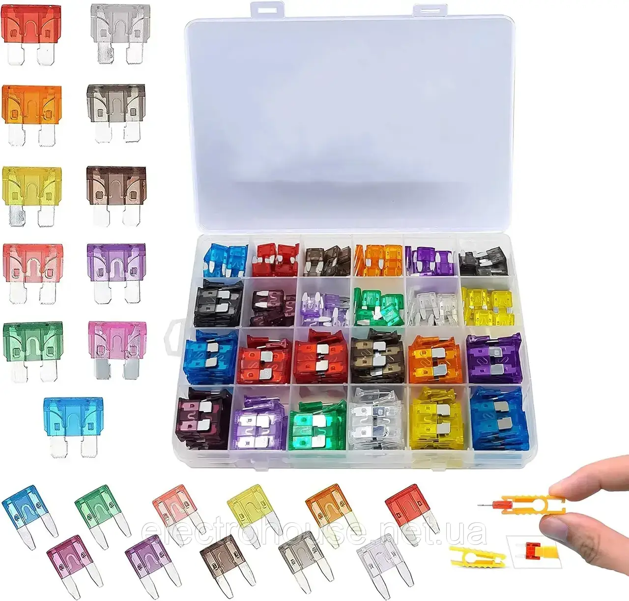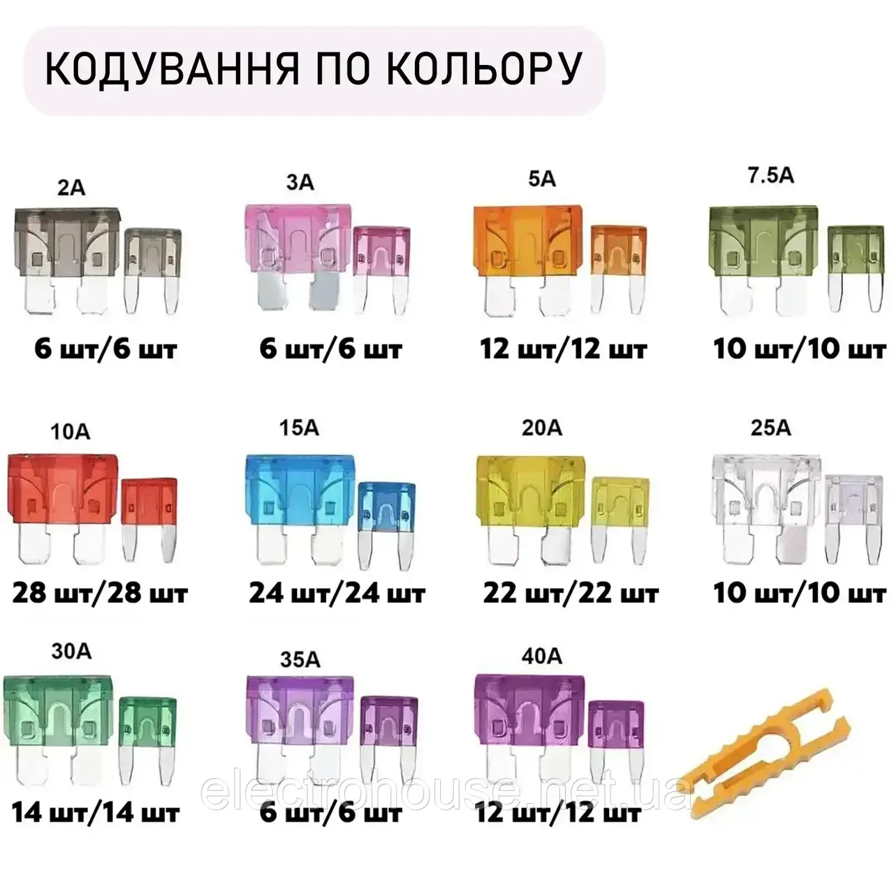 - Мінізапобіжник: 150 шт. (2A-6шт., 3А-6шт., 5А-12шт., 7.5А-10шт., 10А-28шт., 15А-24шт., 20А-22шт., 25А-10шт., 30А-14шт., 35А-6шт. ., 40А-12шт.).