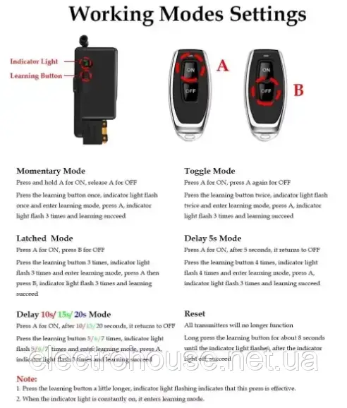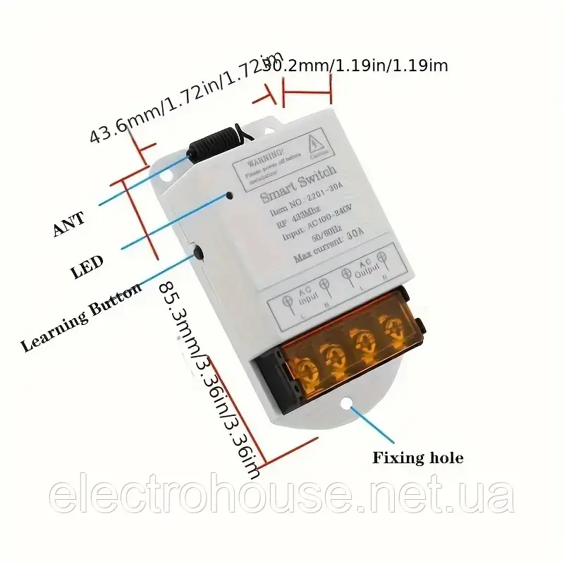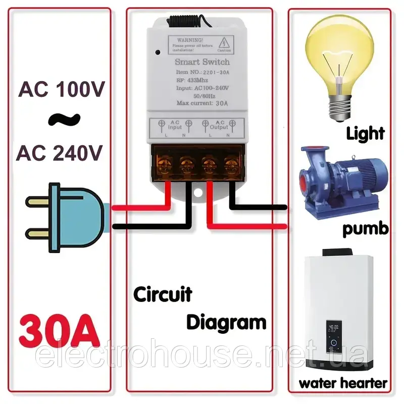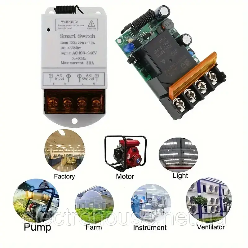 Дистанційний вимикач включає: реле 230в 30А, пульт керування 1шт.. Працює на радіоканалі RF433Mhz.