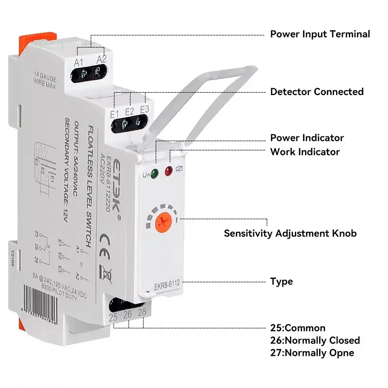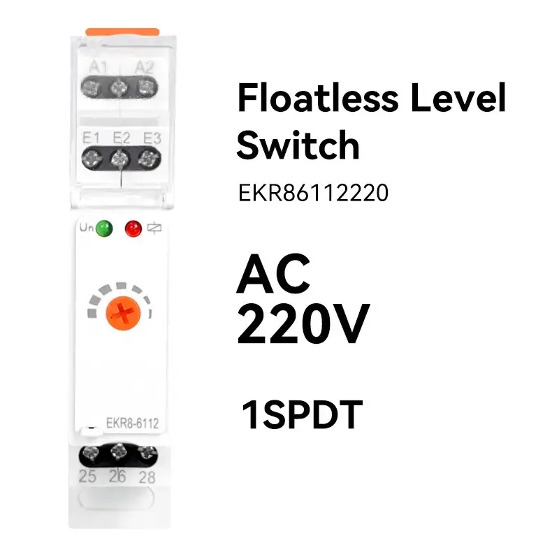 Реле призначене для контролю за рівнем електропровідних рідин із можливістю вибору функцій: докачування або відкачування (PUMP UP або PUMP DOWN). Для запобігання полярності й електролізу рідин і як наслідок оксидації сенсорів використовується змінний струм. Для вимірювання використовуються три сонди: H — верхній рівень, D — нижній рівень і C — загальна сонда. Для запобігання небажаному вмиканню під впливом сторонніх чинників (забруднення зонда, вологість…) можна налаштувати чутливість пристрою відповідно до провідної контрольованої рідини (відповідно до “порушень” рідини) в діапазоні 5 до 100 кΩ. Для обмеження небажаних комутацій вихідних контактів хвилюванням рівня рідини можна налаштувати затримку реакції виходу 0.5-10 Реле призначене для контролю рівня рідини в колодязях, резервуарах, ємностях.