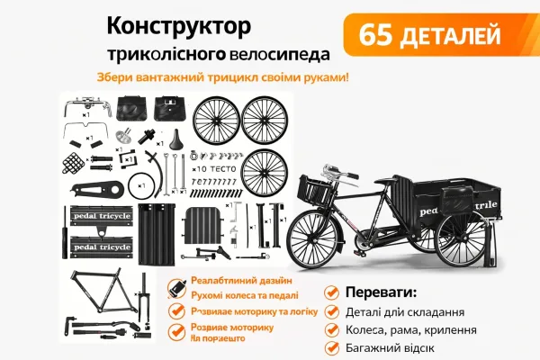 Набір для самостійного складання стильного вантажного трицикла. Ідеально підходить для дітей та дорослих, які люблять техніку та моделі. У комплект входять 65 деталей для створення реалістичного велосипеда з багажним відсіком.