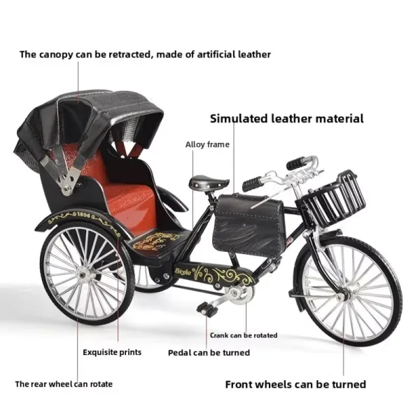 Набір для самостійного складання унікальної моделі вінтажної рикші. В комплект входять 65 деталей, що дозволяють створити реалістичний триколісний велосипед з пасажирським сидінням та навісом.