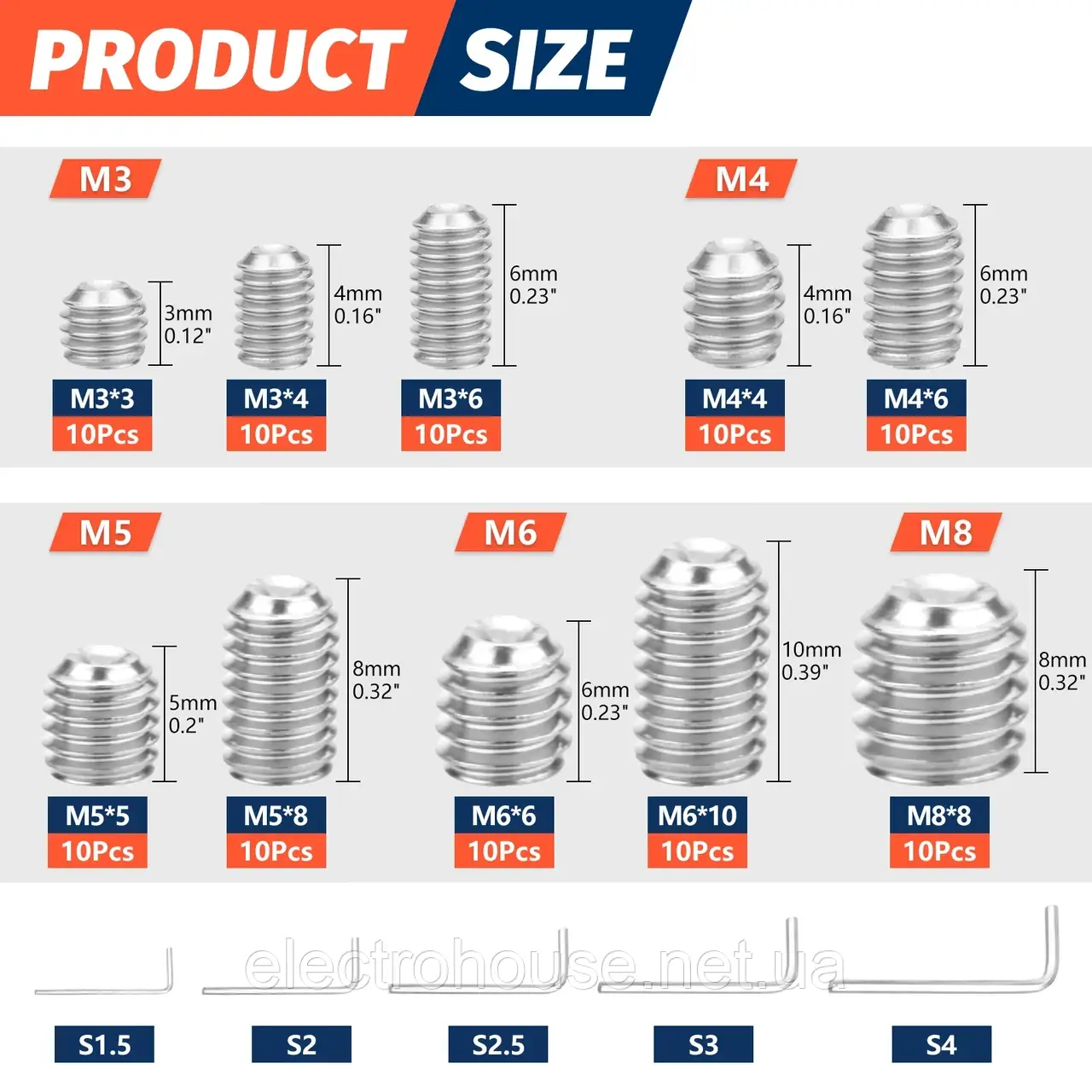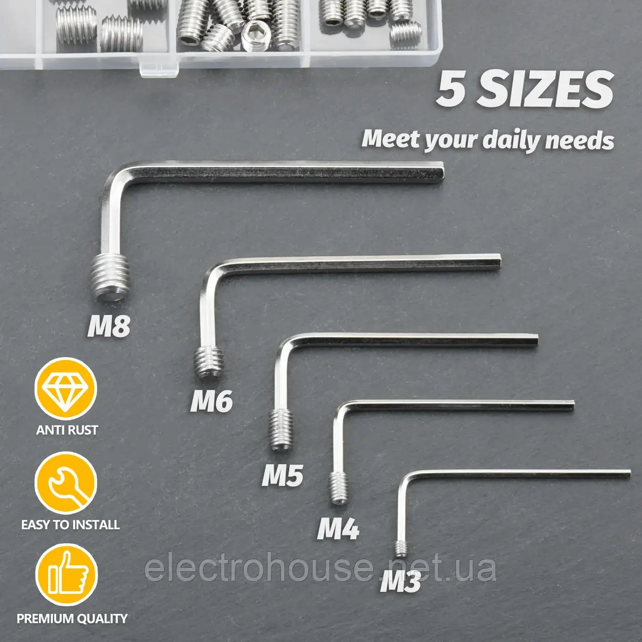 • Універсальні розміри: цей асортимент включає ряд популярних розмірів: M3, M4, M5, M6 і M8, що підходять для різних завдань з ремонту і складання. Кожен розмір доступний в декількох довжинах, що ідеально підходить для різних застосувань.