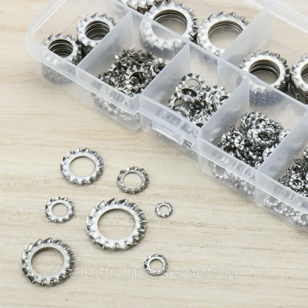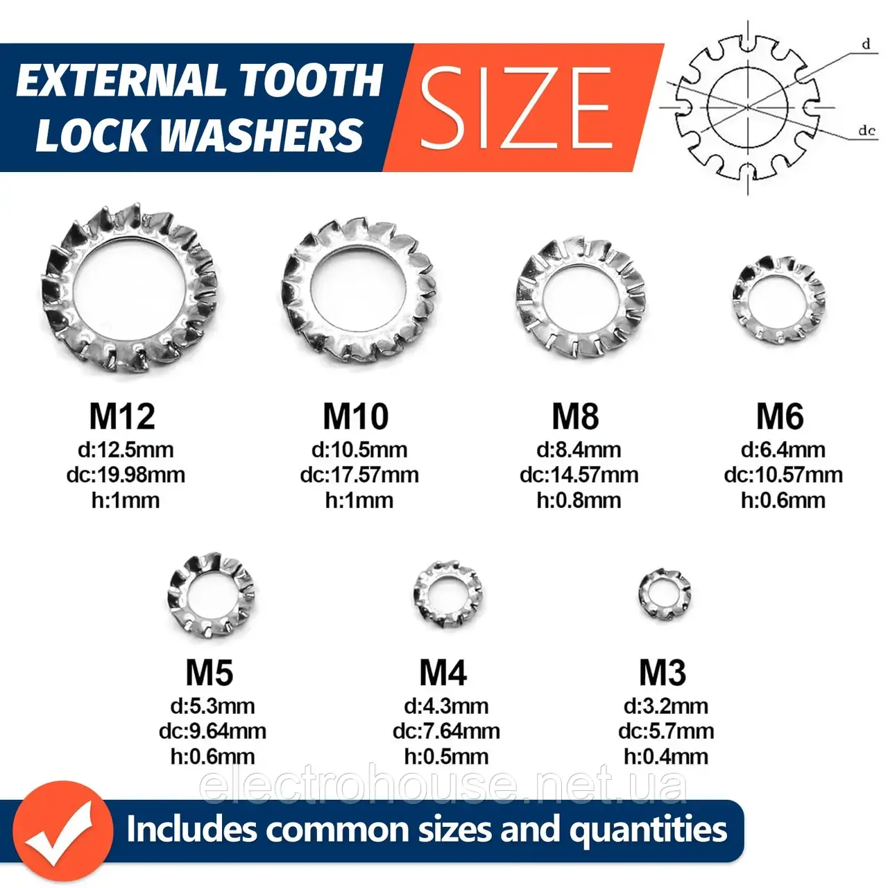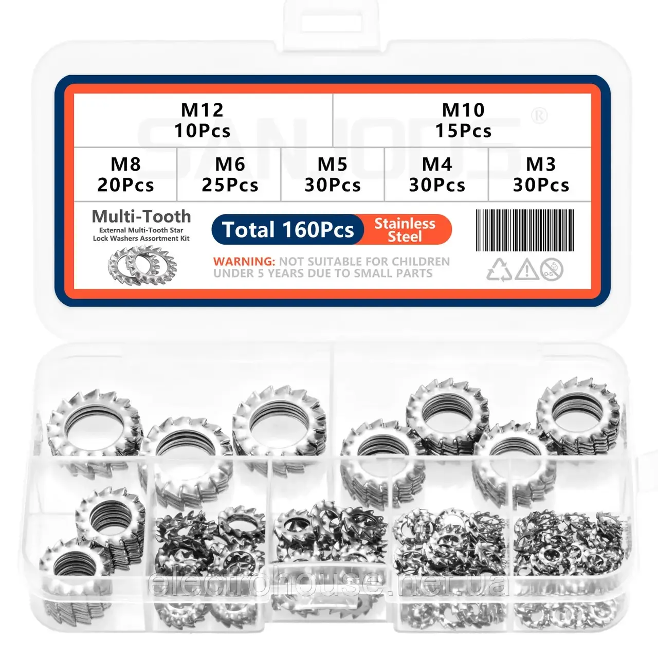 [Зовнішні шайби із зубчастим замком] Високоякісні шайби із зовнішнім зубним замком із нержавіючої сталі, набір із 160 шт., включає найбільш часто використовувані 7 розмірів: M3: 30 шт. / M4: 30 шт. / M5: 30 шт. / M6: 25 шт. / M8: 20 шт. / M10: 15 шт. / M12: 10 шт.