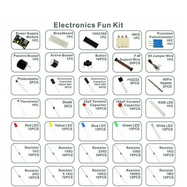 RGB світлодіодний 10 * резистор (10R) 10 * резистор (220R) 10 * резистор (330R) 10 * резистор (1 кОм) 10 * резистор (2 кОм) 10 * резистор (5 К1) 10 * резистор (10 кОм) 10 * резистор (100K) 10 * резистор