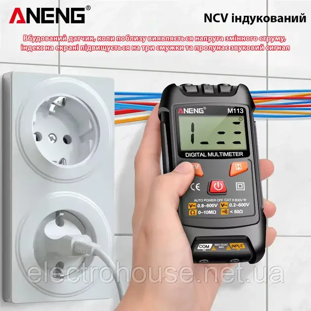 Безконтактний датчик напруги (NCV). – Він використовується для пошуку прихованих проводів під напругою у стіні (ви можете заздалегідь перевірити цвяхи на стіні) або для пошуку прихованих обірваних проводів тощо. Він підходить для використання з більш високою змінною напругою. Він лише оцінює наявність напруги і може виміряти конкретне напруга.