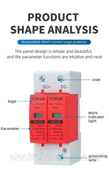 ПЗІП TDNK HR-40 DC2P — це високоефективний обмежувач перенапруги постійного струму (DC SPD), спеціально розроблений для фотоелектричних систем. Пристрої цієї серії підтримують широкий діапазон номінальної напруги: 500В, 600В, 800В і 1000В, що робить їх універсальними для різних конфігурацій сонячних панелей.