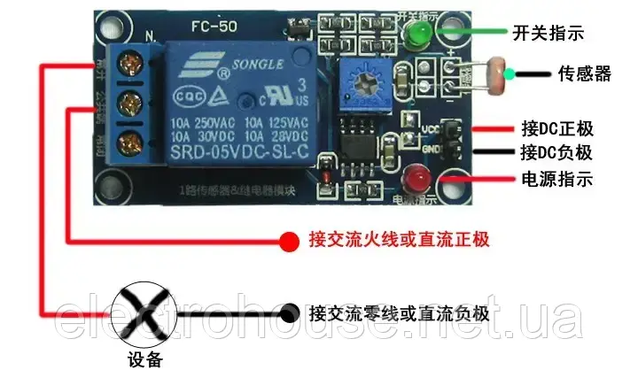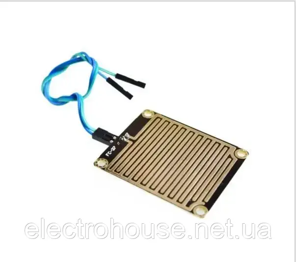 Датчик дощу складається з плати сенсора плати і формування сигналу. Він призначений для виявлення крапель рідини на робочій поверхні плати сенсора, виконаного з високоякісного двостороннього фольгованого склотекстоліти. Наявний потенціометр дозволяє змінити чутливість датчика, тобто сигнал на виході з’явиться навіть при дрібних краплях, або – тільки при сильному дощі. Датчик дощу має два виходи: 1 – цифровий (стрибкоподібно пропадає лог. одиниця) 2 – аналоговий (напруга плавно зменшується пропорційно кількості крапель на поверхні плати сенсора). Датчик дощу зручно кріпити яке існує завдяки кріпильних отворів (чотири – на платі сенсора і одне – на платі формування сигналу). Сигнал керування на виході датчика дощу – чистий, має хорошу форму з силою струму до 15 мА. Датчик дощу може працювати при напрузі живлення від 3,3 до 5,0 Ст. Технічні характеристики Датчик дощу Параметр Значення Uжив. постійне, В +3,3….5,0 Uжив. ном. постійне, У 5,0 Іпотр. макс. при Uжив. ном., мА 0,2 Габаритні розміри плати сенсора, ДхШхВ, мм 54 х 40 х 1,5 Габаритні розміри плати формування сигналу, ДхШхВ, мм 30 х 15 х 8 Температура експлуатації, °С 0…+55 Відносна вологість експлуатації, % 55 … Виробництво Контрактне виробництво у Південно-Східній Азії Гарантійний термін експлуатації 12 місяців Вага, г Комплект поставки Датчик дощу Найменування Кількість Датчик дощу у зборі 1 Перевірка працездатності Датчика дощу Розташуйте пристрій згідно малюнка вище. При цьому призначення контактів наступне: VCC – позитивний контакт харчування. До VCC підключіть червоний позитивний дріт живлення. GND – загальний, мінус харчування. До GND підключіть чорний негативний провід живлення. DO (Digital Output) – цифровий вихід (напруга змінюється різко, стрибкоподібно). AO (Analog Output) – аналоговий вихід (напруга змінюється плавно). – Підключіть +5 до контактів живлення згідно полярності. При цьому світить індикатор живлення. На виході DO є високий рівень (лог. 1). Індикатор стану виходу не світить. – Капніть одну/кілька крапель рідини на поверхню плати сенсору (замыканите пару сусідніх доріжок пінцетом). При цьому напруга на вході DO пропадає (лог. 0). Індикатор стану виходу світить. – Змахніть краплі рідини з поверхні плати сенсору (приберіть пінцет з сусідніх доріжок). При цьому все повертається в початковий стан, тобто на виході DO з’являється високий рівень (лог. 1). – Вихід DO (Digital Output) можна підключити до ключа з реле, наприклад, Силовик-4 або до цифрового входу будь-якого мікроконтролера. – Вихід AO (Analog Output) можна підключити до аналогового входу будь-якого мікроконтролера.