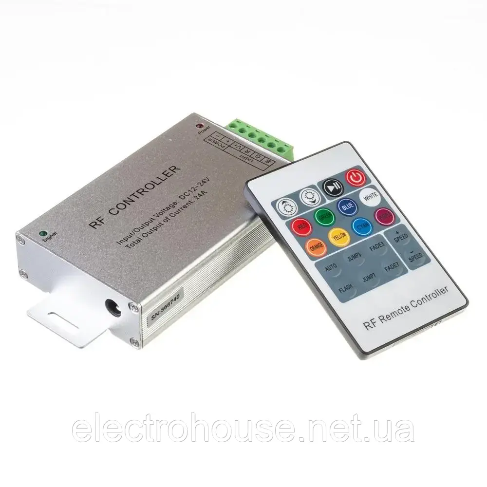 RGB контролер 24А-RF-20 кнопок, спеціальний пристрій, призначений для управління кольором і режимом світіння світлодіодним RGB LED стрічкою. Вихідний струм цього контролера 24А, режим управління пульта зв'язку радіо RF. Радіус дії радіосигналу не більше 100 метрів. Пульт розрахований на 20 кнопок і ловить навіть через стіни.