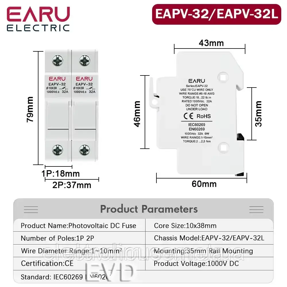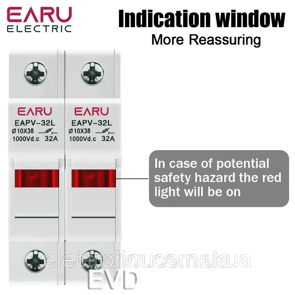 EARU EAPV-32тримач запобіжників 10*38мм 2P з LED індикацією 1000V DC для сонячних панелей (PV систем) DIN