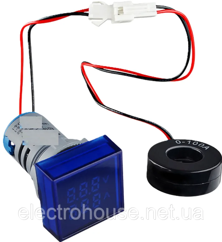 Цифровий вольтметр-амперметр змінної напруги квадратний, вбудовується на панель. Не потребує додаткового живлення. Діапазон вимірювання: напруга 50 … 500VAC / ток 0 … 100A. Колір індикації синій. Розмір монтажного отвору: діаметр 20,5 мм, глибина: 37 мм. Розмір індикатора: 31×31 мм, довжина пристрою: 51 мм|Призначення: Вимірювання вольтметр|Тип виробу: Готовий модуль