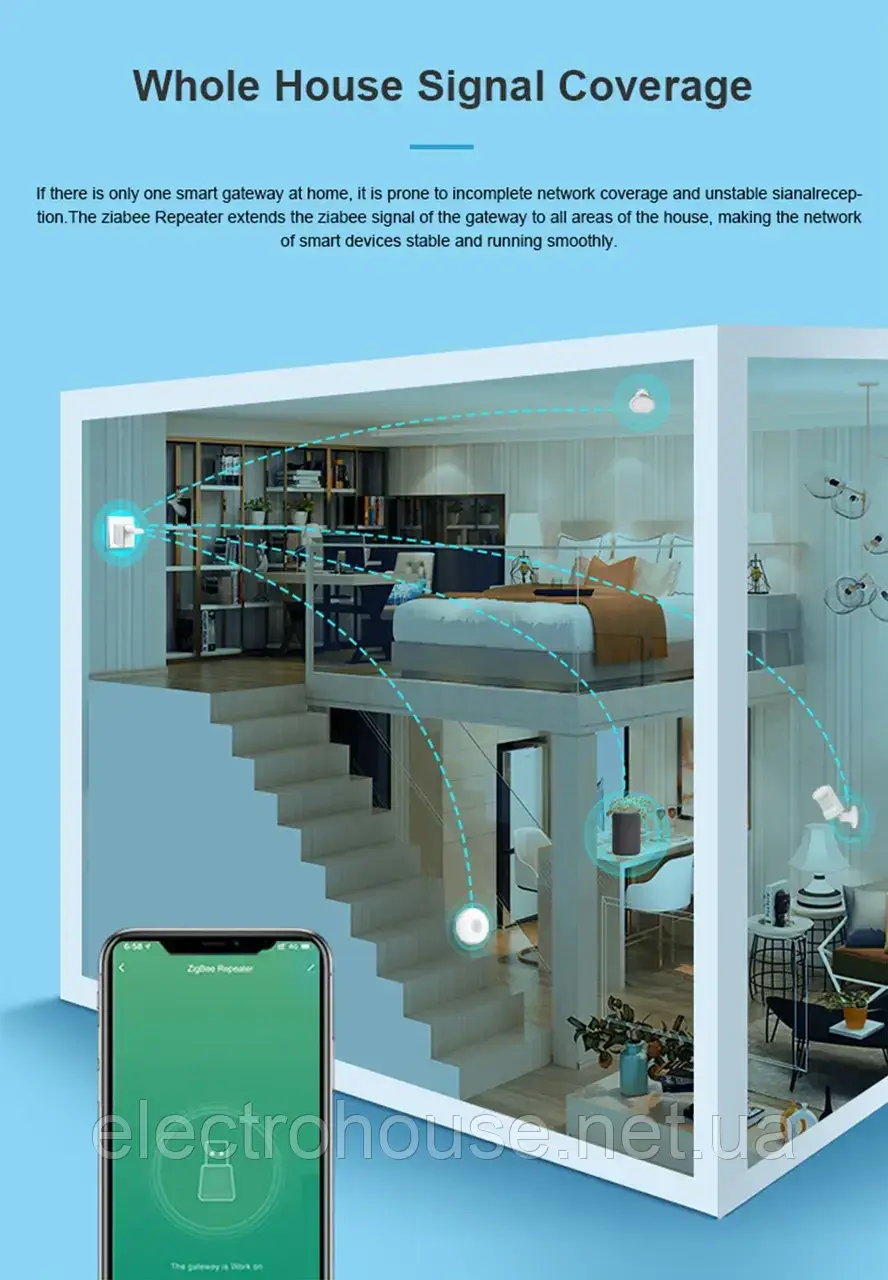 Принцип роботи: розширювач мережі ZigBee (репітер) приєднується до контролера (шлюзу, хабу) ZigBee, після чого він автоматично визначає і посилює (збільшує) поточну мережу ZigBee. Не вимагає будь-якого додаткового налаштування. Працює автономно.