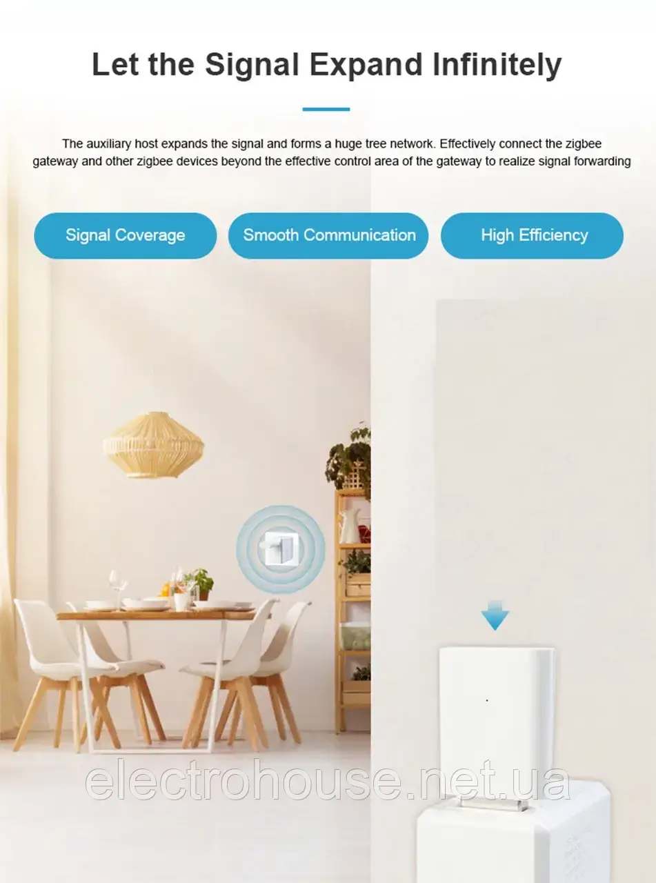 Якщо сигнал Zigbee не може дістати до потрібного вам місця, якщо кінцевий пристрій знаходиться за межами основної мережі ZigBee – далеко або у разі наявності значних перешкод між пристроями, тоді ви можете використовувати цей повторювач сигналу. Підсилювач сигналу Zigbee може розширити зону покриття до 15-20M.